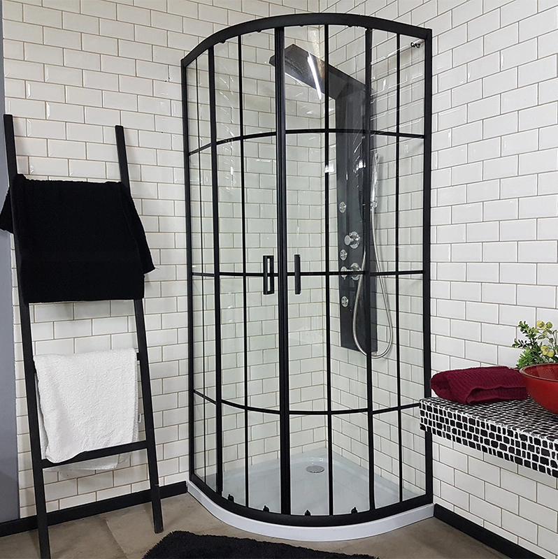 Box de Ducha Semicircular con puertas corredizas. (2 hojas rectas fijas y 2 Hoja corredizas curva). Perfil aluminio anodizado y Cristal 5 mm.