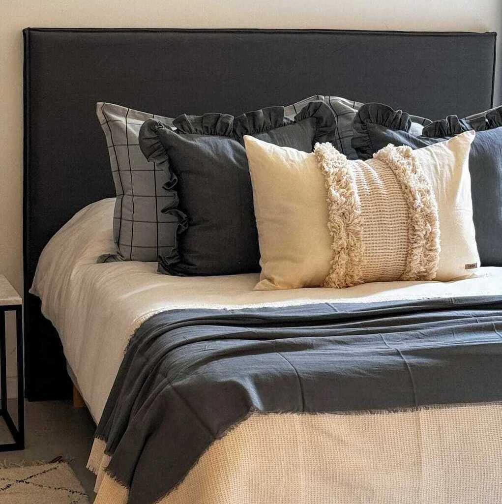 Estructura realizada en madera con relleno, tapizado con liezo y enfundado en tussor que se puede extraer a para lavar. Funda con pestaña.