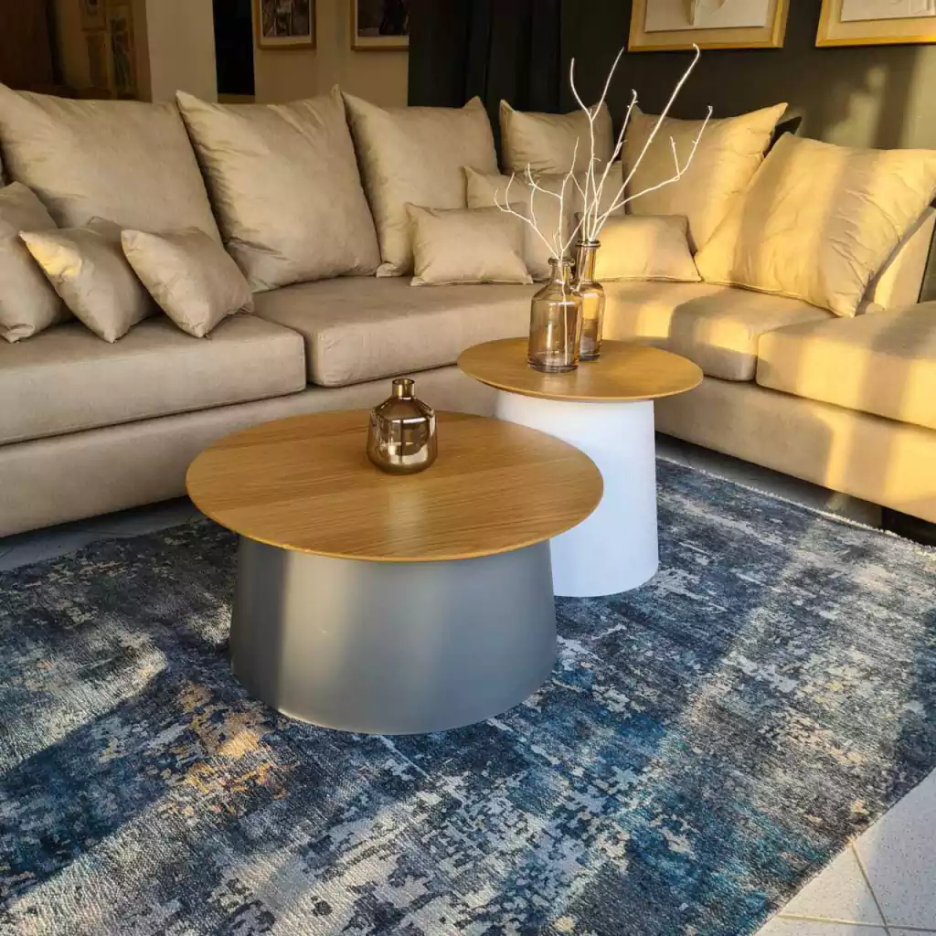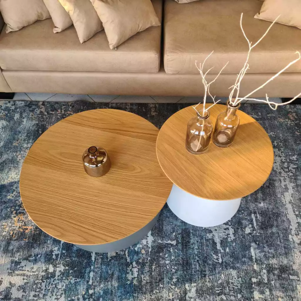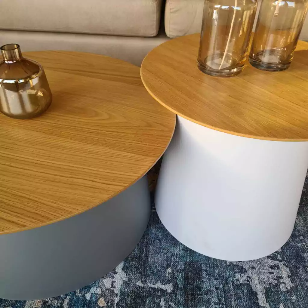 Este set es perfecto para espacios de living, dormitorios o áreas de descanso, brindando superficies auxiliares que se adaptan a múltiples usos. Su diseño compacto y moderno las convierte en piezas versátiles y funcionales para el hogar.