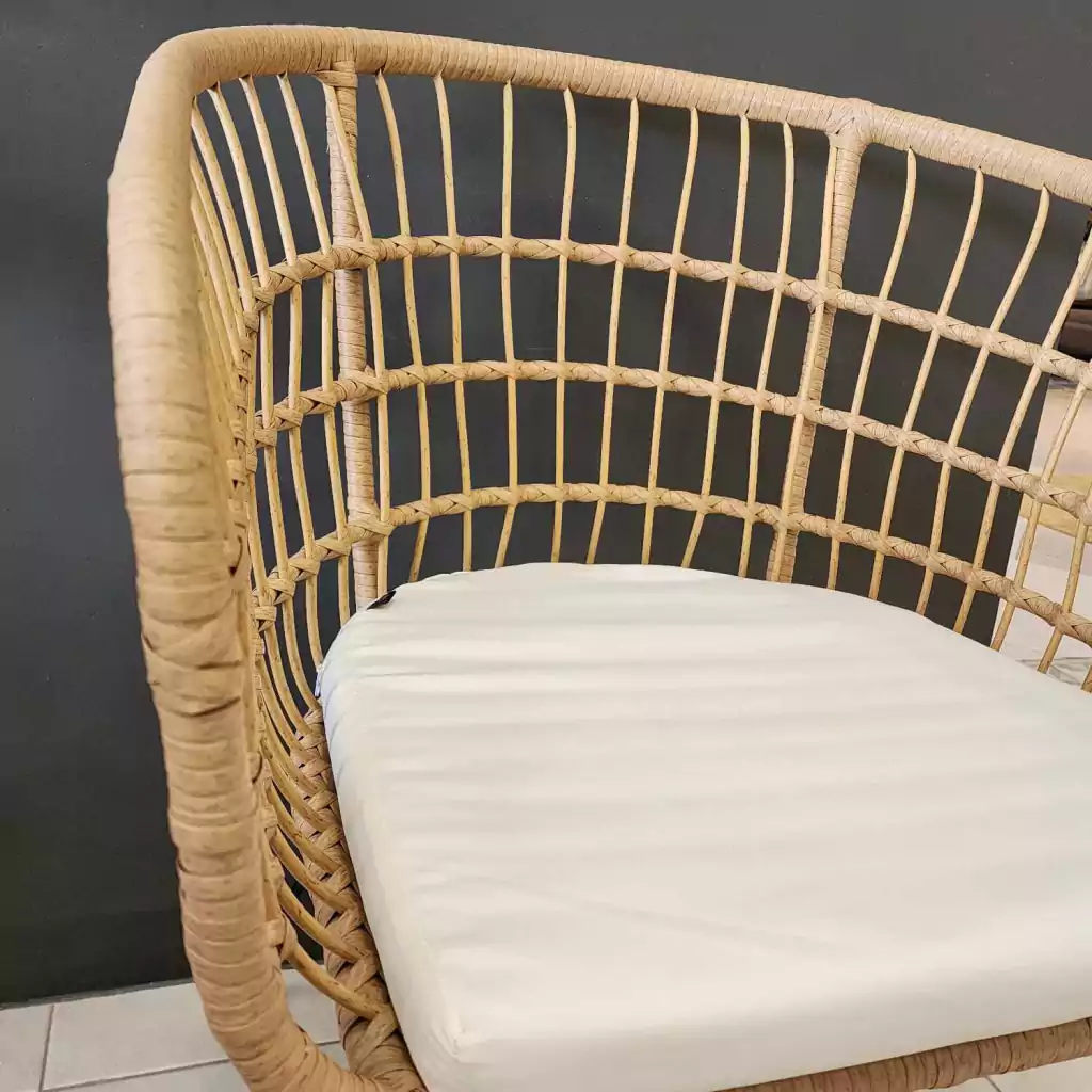 Realizado en rattan sintetico color natural, apto interperie, resistente al sol y agua.
